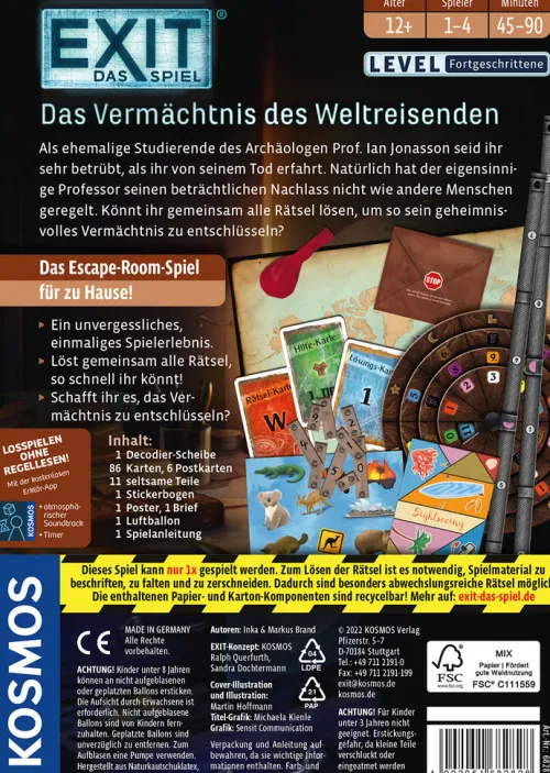 Aus der erfolgreichen Spielereihe „EXIT® – Das Spiel“. Das Escape-Room-Spiel für zu Hause. Kommt mir EXIT® auf Weltreise und löst spannende Rätsel! 1-4 SpielerInnen lösen im Team clevere Rätsel und brauchen dazu Teamgeist, Kreativität und Kombinationsgeschick. Kooperatives Erlebnisspiel im Level: Fortgeschrittene. Mit Tutorial und Timer in der kostenlosen KOSMOS-Erklär-App. Mit und ohne App spielbar. Gesellschaftsspiel für Erwachsene, Fans von Live Escape Rooms und Familien ab 12 Jahren. Ideal als Partyspiel, Eventspiel und als Geburtstagsgeschenk. Da die Materialien für die außergewöhnlichen Rätsel verändert werden, nur einmal spielbar! Mit EXIT® einmal um die Welt! Vor kurzem ist der weltberühmte Professor Ian Jonasson gestorben. Der Archäologe liebte Rätsel! Seine Reisen führten ihn in alle Gegenden der Erde. Hier suchte er unermüdlich nach verschollen geglaubten Schätzen, entzifferte Codes und übersetzte Geheimschriften. Auf der Suche nach seinem Nachlass könnt ihr gemeinsam in diesem Spiel beweisen, was ihr vom Professor gelernt habt. Könnt ihr das Vermächtnis des Professors entschlüsseln? Zum Glück stehen in diesem Escape Room Spiel viele Hilfsmittel zur Verfügung. Schnell, die Zeit läuft! Mit der Reihe „EXIT® – Das Spiel“ bringt KOSMOS das Gefühl der Live-Escape-Rooms zu euch nach Hause. Jede Box bietet einer Gruppe von 1 bis 4 Personen ein außergewöhnliches Spielerlebnis für einen einmaligen und absolut unvergesslichen Abend! Der Wettlauf gegen die Zeit und die cleveren Rätsel dieser innovativen Spielreihe sorgen für Spannung und geistige Herausforderung in den eigenen vier Wänden. Um die Rätsel zu lösen und sich somit gemeinsam aus der misslichen Lage zu befreien ist Teamgeist gefragt! Also arbeitet gut zusammen, denn die Zeit läuft. . . Live-Escape-Feeling im Fortgeschrittenen-Level. Inhalt: 86 Karten, 1 Decodier-Scheibe, 11 seltsame Teile, 6 Postkarten, 1 Aufkleberbogen, 1 Poster, 1 Brief, 1 Luftballon, 1 Spielanleitung