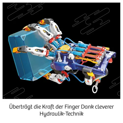 Mit diesem Bausatz entsteht eine präzise steuerbare Roboter-Hand, die dreimal so groß ist, wie die eigene Hand. Große Dinge greifen oder kleine Teile aufsammeln oder schreiben? Kein Problem! Doppelter Spaß: Erst bauen, tüfteln und schrauben, dann ausprobieren und forschen. Einfach genial: die Finger bewegen sich allein durch Wasserdruck – so wird Hydraulik anschaulich vermittelt! Die strukturierte Anleitung startet mit einem witzigen Abenteuer-Comic und führt Schritt für Schritt durch die Bauanleitung. Wozu man Exo-Skelette im echten Leben braucht, wird auf den Nachgehakt-Seiten verraten. Die Einzelteile des Bausatzes werden zusammengesteckt oder mit dem beiliegenden Schraubendreher verschraubt – kein Kleben notwendig. Passend für Links- und Rechtshänder und alle Handgrößen. Der Experimentierkasten Cyborg-Hand von KOSMOS ist eine spannende Mischung aus technischem Lernen und langanhaltendem Spiel-Spaß für Kinder zwischen 10 und 14 Jahren. Bauen, tüfteln, ausprobieren – in der Cyborg-Hand steckt echter Technik-Spaß! Kinder bauen das mechanische Exo-Skelett aus vielen Einzelteilen zusammen, den passenden Schraubendreher finden sie in dem Set. Ist die Exo-Hand fertig, wird sie über die eigene gezogen und schon werden die Bewegungen präzise auf die künstliche Hand übertragen. Genial: die Roboterhand funktioniert hydraulisch, also nur über den Druck von Wasser! Heben, schreiben, zeichnen. . . einfach ausprobieren und staunen. Die Cyborg-Hand kann viel größere Dinge heben als eine Kinderhand, aber auch kleine Teile schafft sie spielend. Sogar das Aufräumen könnte nun endlich Spaß machen! Das Anleitungsheft startet mit einem Abenteuer-Comic und erklärt die Montage Schritt für Schritt. Außerdem hält es spannendes Hintergrundwissen bereit: Wofür brauchen Menschen die Exo-Skelette und von welchen Tieren konnten sich Forscher etwas abschauen? Greifen und Begreifen – ein Tüftlerspaß für Kinder zwischen 10 und 14 Jahren.