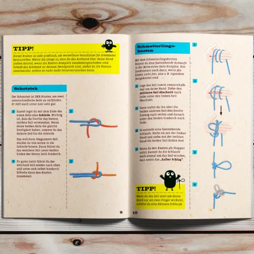 – Ausführliche Schritt-für-Schritt-Anleitung: Das liebevoll gestaltete Anleitungsheft zeigt vom einfachen Überhandknoten bis zum Palstek, alle Handgriffe in leicht verständlichen Bildern