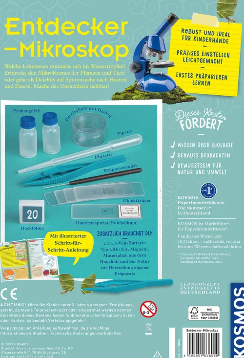 – Mit dem Komplettset inkl. Präparierzubehör wird das Herstellen einfacher Untersuchungsobjekte und Präparate erlernt. Ein perfekter Start als Natur-Detektiv!