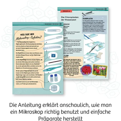 – Das Begleitheft enthält eine übersichtliche Anleitung zur Benutzung des Mikroskops und ermöglicht mit spannendem Hintergrundwissen einen einfachen, wissenschaftlichen Einstieg in die Mikroskopie.
