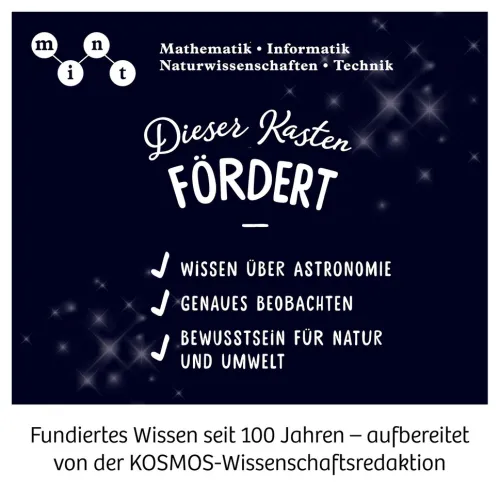 Mit dem „Zimmer-Planetarium“ von KOSMOS den Sternhimmel und Himmelsobjekte ganz einfach im Kinderzimmer erkunden und Dank Auto-Timer- und Drehfunktion der Kuppel als beruhigendes Nachtlicht nutzen. 32 atemberaubende Weltraumbilder auf vier Wechselscheiben und drei Kuppeln mit Sternkarten des Nord- und Südhimmels sorgen für Abwechslung. Die beiden Projektoren werfen zwei Bilder gleichzeitig an die Zimmerdecke, so können die Kinder die Sternkarten und Weltraumobjekte immer wieder neu kombinieren. In der Anleitung finden sich spannende Fakten über Himmelskörper und das Universum sowie praktische Tipps zur Himmelsbeobachtung draußen. Egal, ob zum Erkunden unendlicher Weiten oder als Nachtlicht: Das KOSMOS Zimmer-Planetarium mit praktischem USB-Anschluss eignet sich für alle Astronomiebegeisterte ab acht Jahren. Was für ein Anblick, wenn die eigene Zimmerdecke zum Sternenhimmel wird – das Zimmer-Planetarium von KOSMOS macht’s möglich! Egal, ob Sternbilder, Planeten oder ferne Galaxien – dank der drei Sternkuppeln und 32 Weltraumbilder auf vier Bilderscheiben lässt sich das Universum ganz einfach im Kinderzimmer erkunden. Das Highlight: Die beiden Projektoren werfen mit ihren leuchtstarken LEDs gleich zwei Bilder an die Decke, so können die Kinder die Sternkarten mit den Weltraumobjekten immer wieder neu kombinieren. Die Anleitung erklärt astronomische Hintergründe zu Sternbildern und Objekten des Nachthimmels und bietet praktische Tipps für die Himmelsbeobachtung in freier Natur; ein beigelegtes Erklärposter erläutert und benennt die Sternbilder und Himmelsobjekte der Bildscheiben. Besonders praktisch: ein integrierter Auto-Timer machen das Planetarium auch zum beruhigenden Nachtlicht und schaltet sich nach 15, 30 oder 60 Minuten automatisch ab.