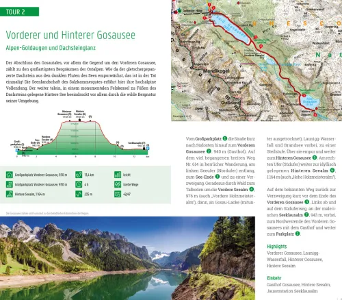 - Die detaillierten Wegbeschreibungen werden durch Höhenprofile, Kurzinfos und Kartenausschnitte ergänzt.