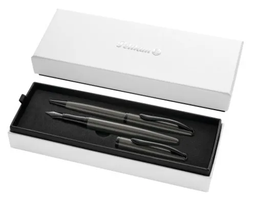 Polierte Edelstahlfeder in mittlerer Strichstärke; Ausgestattet mit einer Pelikan Großraum-Tintenpatrone; Blaue Füllhaltertinte; Metall-Kugelschreiber mit Drehmechanik; Ausgestattet mit wechselbarer Großraum-Mine; Blaue, nach ISO 12757-2 dokumentenechte Paste.