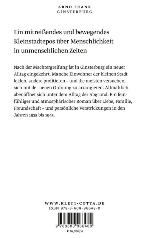 Nach der Machtergreifung ist in Ginsterburg ein neuer Alltag eingekehrt. Manche Einwohner der kleinen Stadt leiden, andere profitieren – und die meisten versuchen, sich mit der neuen Ordnung zu arrangieren. Allmählich aber öffnet sich unter dem Alltag der Abgrund. Ein feinfühliger und atmosphärischer Roman über Liebe, Familie, Freundschaft – und persönliche Verstrickungen in den Jahren 1935 bis 1945.
