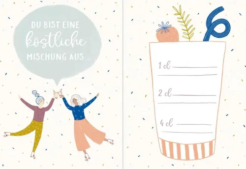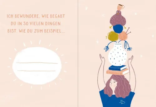 Mit jeder Seite, die du ausfüllst, entsteht ein ganz individuelles Geschenk. Lass deiner Kreativität freien Lauf und führ dir dabei selbst noch einmal vor Augen, wie toll diese Herzensfreundin eigentlich ist. Und die Beschenkte? Sie wird sich über jedes Kompliment, jede Eintragung und jedes kleine Detail riesig freuen.