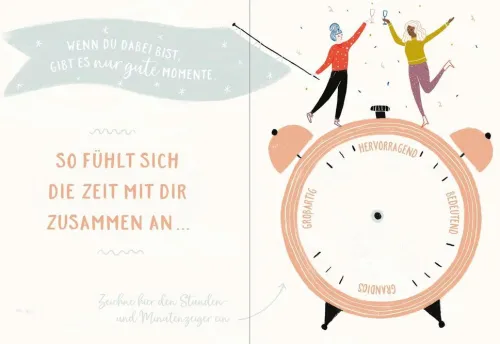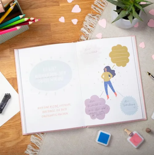 Personalisiere die vorgefertigten Seiten mit liebevollen Komplimenten, Erinnerungen und gemeinsamen Erlebnissen. Verschenke so ein ganz besonderes Einzelstück! Bring deine persönliche Note ein und zeige deiner Freundin, dass mit ihr die ganze Welt ein bisschen bunter ist. Im Handumdrehen entsteht so ein liebevolles und einzigartiges Erinnerungsalbum.