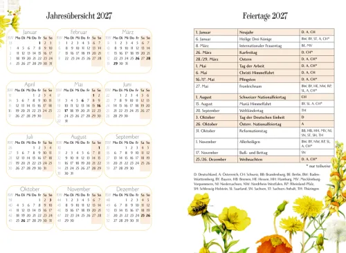 Dieser hochwertige GlücksKalender ist mehr als nur ein Wochenplaner – hier können die schönen Erlebnisse des Alltags festgehalten werden und einzigartige Illustrationen der Künstlerin Marjolein Bastin begleiten durch das ganze Jahr. Auf einer liebevoll gestalteten Doppelseite pro Woche finden neben den Terminen auch noch die aktuelle Stimmung und der Glücksmoment des Tages Platz. Das Kalendarium wird durch Feiertage, Mondphasen und Sternzeichen ergänzt und machen diesen GlücksKalender zum perfekten Begleiter für das Jahr 2027.