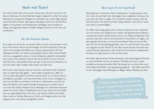 Doch neben all den Verpflichtungen sollen auch positive Aspekte nicht zu kurz kommen! Kleine Aufgaben helfen dabei, den Fokus mindestens einmal am Tag auf sich selbst und die eigenen Bedürfnisse zu lenken. Ein täglicher Habit Tracker erleichtert die Integration gesunder Gewohnheiten. Monatliche Inspirationstexte von Gnu bringen die Wichtigkeit von Pausen, Achtsamkeit und Selfcare näher.