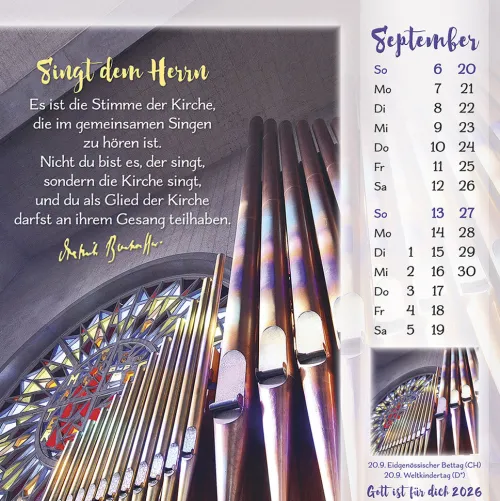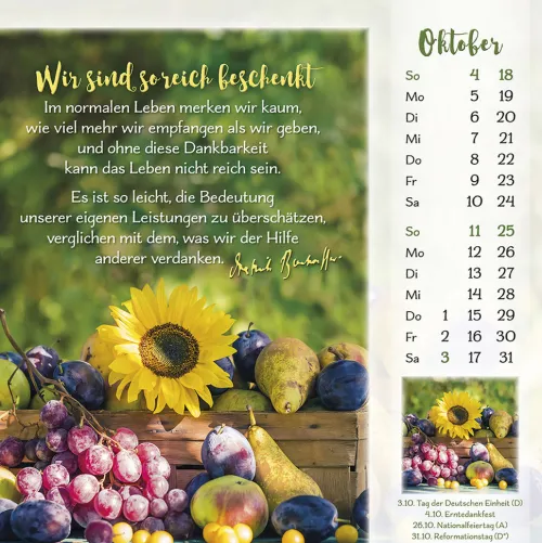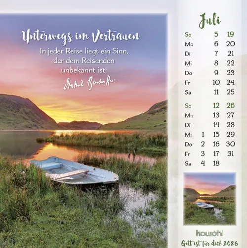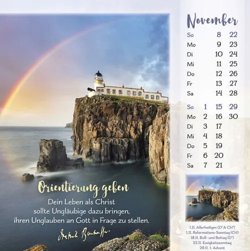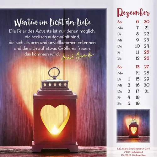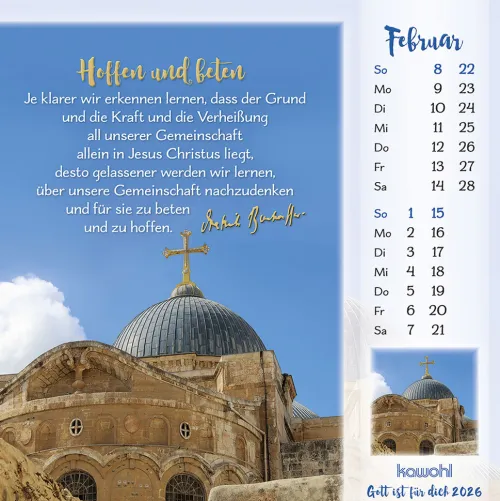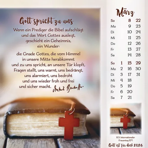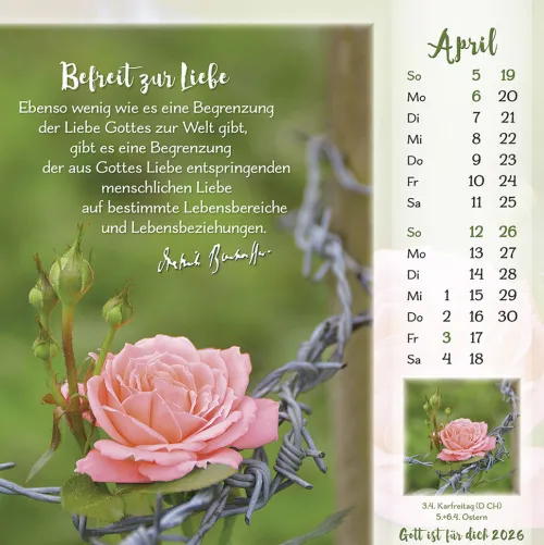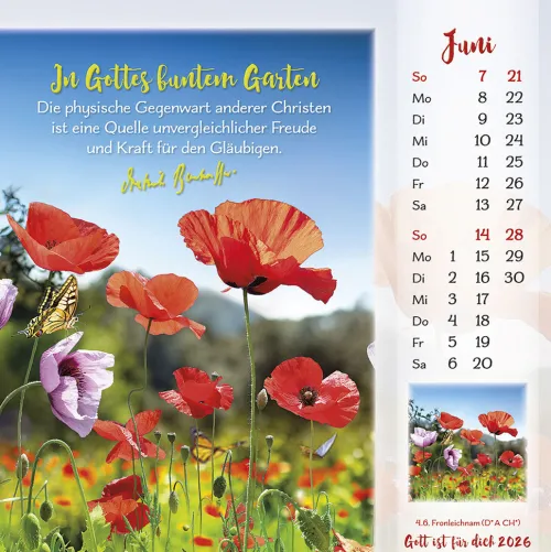 Gott ist für dich 2026Dietrich Bonhoeffer hat uns durch sein Denken, Wirken und Schreiben als evangelischer Theologe wie kaum ein anderer Gottesmann einen großen geistlichen Reichtum hinterlassen. In diesen Kalendern finden Sie besonders prägnante Sinnsprüche und Zitate aus der Feder Bonhoeffers, kombiniert mit brillanten, symbolstarken Bildern. Entdecken Sie diese wertvollen Begleiter durch das Jahr – zur geistlichen Inspiration, Orientierung und Ermutigung. Postkarten-Kalender 16 x 16 cm14 Blätter, Postkartenkarton, Spiralbindung.
