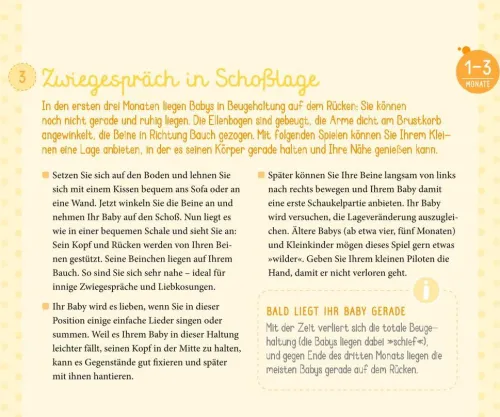 Nie wieder entwickelt sich ein Baby so rasant wie im ersten Lebensjahr! Mit PEKiP, dem Prager-Eltern-Kind-Programm, können Eltern diese Entwicklung ihres Babys optimal unterstützen und eine gute und sichere Bindung aufbauen. Dieser wunderschöne gestaltete Aufsteller versammelt dazu die 50 schönsten PEKiP-Spiele und -Anregungen, klar beschrieben, mit einem Farbfoto illustriert und Dank des praktischen Formates während der Spielzeit immer im Blick. Die Bewegungs-, Sinnes- und Spielanregungen begleiten die Entwicklung Ihres Kindes dem individuellen Entwicklungsstand entsprechend: 0-3 Monate; 4-6 Monate; 7-12 Monate. So können Eltern mit ihrem Baby eine wunderschöne gemeinsame Spielzeit genießen und gleichzeitig seine Fähigkeiten gezielt fördern.