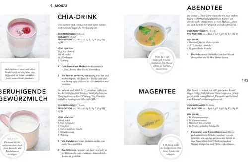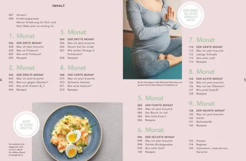 Im Kochbuch werden die einzelnen Schwangerschaftsmonate genau dargestellt – immer mit einer Übersicht, welche Nährstoffe jetzt besonders wichtig sind. Es folgen Rezepte für Smoothies und Säfte, frische Salate, Rohkost sowie warme Mahlzeiten. Immer mit dem Hinblick auf die optimale Nährstoffversorgung.