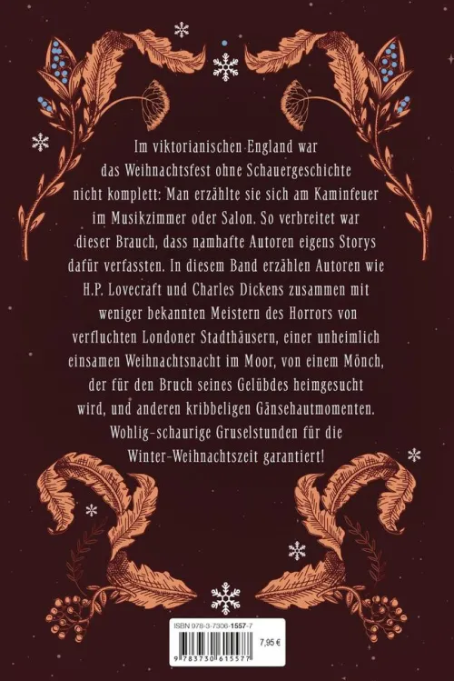 Im viktorianischen England war das Weihnachtsfest ohne Schauergeschichte nicht komplett: Man erzählte sie sich am Kaminfeuer im Musikzimmer oder Salon. So verbreitet war dieser Brauch, dass namhafte Autoren eigens Storys dafür verfassten. Im zweiten Band der schaurigen Weihnachtsgeschichten erzählen Autoren wie H. P. Lovecraft, Charles Dickens zusammen mit weniger bekannten Meistern des Horrors von verfluchten Londoner Stadthäusern, einer unheimlich einsamen Weihnachtsnacht im Moor, von einem Mönch, der für den Bruch seines Gelübdes heimgesucht wird, und anderen kribbeligen Gänsehautmomenten mehr. Wohlig-schaurige Gruselstunden für die Winter-Weihnachtszeit garantiert!