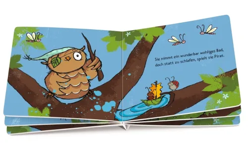 Wenn kleine Eulen schlafen gehen: Mama möchte ihr Eulenkind ins Bett bringen. Dumm nur, dass die Kleine noch ganz und gar nicht müde ist. Sie versucht allerlei Sachen, um müde zu werden. Sie lauscht den Vögeln, nimmt ein wohliges Bad oder trinkt einen Tee aus Blättern. Doch statt einzuschlafen, singt sie mit den Vögeln, spielt in der Wanne Pirat oder muss vom vielen Trinken wieder aufs Klo. Erst als Mama ihr schließlich einen Gutenacht-Kuss gibt, schlummert die kleine Eule friedlich ein. „Gute Nacht, kleine Eule“ von Tanja Jacobs und Susanne Weber ist ein Gute-Nacht-Buch für die Kleinsten.