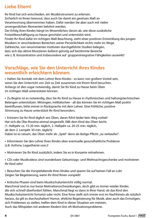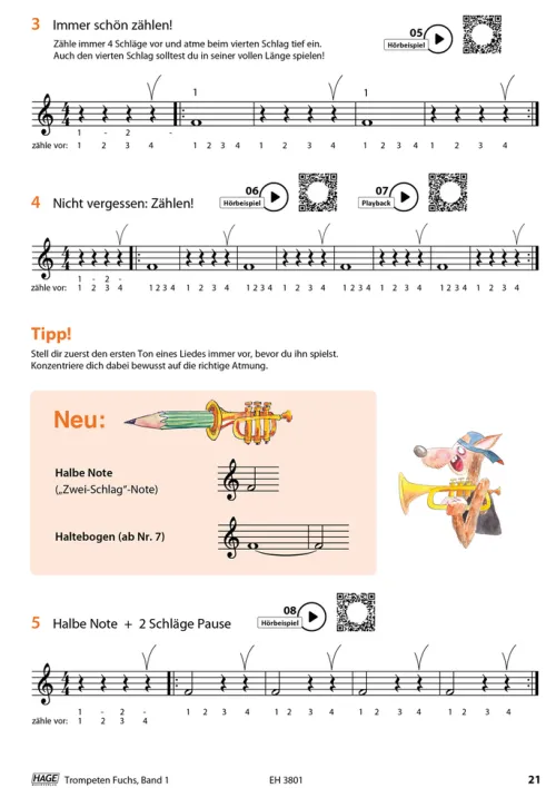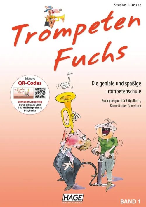 Spielerisch und mit Begeisterung erlernen die Anfänger Schritt für Schritt das Trompetenspiel. Viele neue, aber auch bewährte methodische Wege sind in diese Schule eingearbeitet. Der Trompeten Fuchs gehört mittlerweile zu den erfolgreichsten Trompetenschulen der letzten Jahre. Die komplette Schule umfasst 3 Bände. Ideal für den Einzel- oder Gruppenunterricht und das Selbststudium. Auch geeignet für Flügelhorn, Kornett oder Tenorhorn. Internationale Spitzenlehrer wie Reinhold Friedrich und Bo Nielsson empfehlen diese Schule. Warum? Weil das Konzept des Trompeten Fuchs wirklich funktioniert. Unzählige tolle Solostücke und Duette, musikalisch wertvolle Etüden, technische-, flexibilitäts- und ansatzaufbauende Übungen sowie ein lyrisch-sanglicher Zugang zur „Kunst des Trompetenspiels“ tragen mit dazu bei, dass die Schüler nicht nur gut spielen, sondern auch gut klingen. Markenzeichen dieser Schule ist auch ihr Humor: Mit zahlreichen Comics lenkt der Autor die Aufmerksamkeit der Schüler und Lehrer dorthin, wo sie sein sollte: Zur Freude am Musizieren. Mit über 140 tollen Hörbeispielen und Playbacks macht es Spaß zu spielen. Die Audio- beispiele werden per QR-Code aufgerufen, die man ganz einfach über Smartphone oder Tablet abspielen kann. Die Titel wurden von Stefan Dünser eingespielt. So beurteilen Spitzentrompeter den Trompeten Fuchs:Reinhold Friedrich, einer der gefragtesten Solisten weltweit: „Der Trompetenfuchs ist ‚die Anfängerschule‘. Eine Methode, die profunde Sachkenntnis, alle modernen methodischen Ansätze, und eine große Portion Humor und Spielfreude in drei Bänden bündelt. Dank Stefan Dünser gibt es nun eine lockere undogmatische Schule, die den Kindern und den Lehrern Spaß macht – und deshalb Erfolg bringt. ENDLICH!“Bo Nilsson, international tätiger Starlehrer/Schweden: „Die Schule ist ausgezeichnet. Ich empfehle sie sehr oft.“