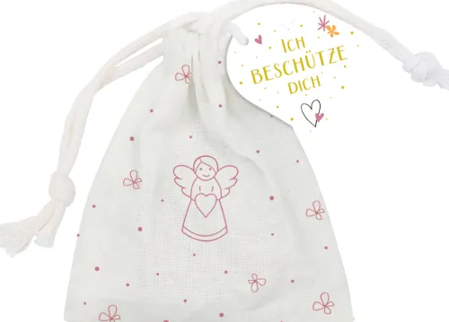 Handschmeichler aus Porzellan in Herzform mit goldener Engelgravur / in Baumwollbeutel mit Grußanhän