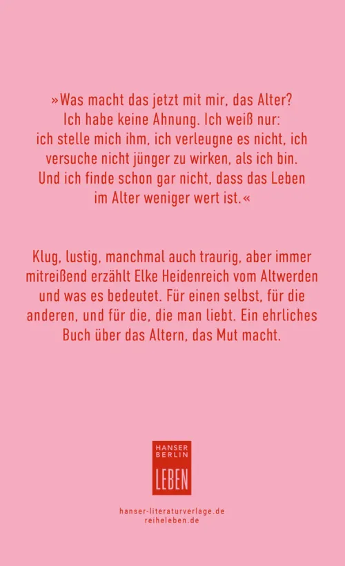 Reihe Leben: Elke Heidenreich schreibt ganz persönlich über ein Thema, das uns alle betrifft. Ein ehrliches Buch über das Altern, das Mut macht. Alle wollen alt werden, niemand will alt sein. Der Widerspruch ist absurd, das Leiden daran real. Wie lernen wir, so gut wie möglich damit zurechtzukommen? Geht das, alt werden und ein erfülltes Leben führen? Elke Heidenreich hat sich mit dem Altwerden beschäftigt. Herausgekommen ist dabei ein Buch, wie nur sie es schreiben kann. Persönlich, ehrlich, doch nie gnadenlos, mit einem Wort: lebensklug. Sie denkt über ihr eigenes Leben nach, und das heißt vor allem, über ihre Beziehungen zu anderen Menschen. Im Alter trägt man die Konsequenzen für alles, was man getan hat. Aber mit ihm kommt auch Gelassenheit, und man begreift: „Das meiste ist vollkommen unwichtig. Man sollte einfach atmen und dankbar sein.“