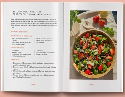 Zusätzlich wird auf die vier Zyklusphasen eingegangen, mit begleitendem Wissen und Tipps, wie du deine Ernährung, dein Energielevel und dein Körpergefühl besser im Einklang mit deinem hormonellen Rhythmus gestalten kannst.