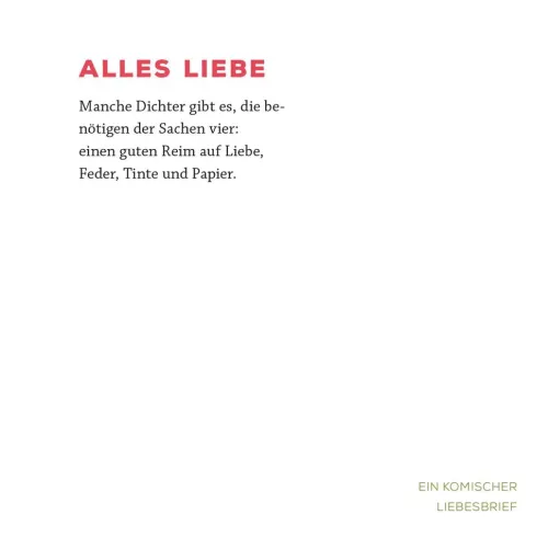 Von Liebesbotschaften und Lockenwicklern, frischen und gut gereiften Gefühlen – Heinz Erhardts »Sinn für Unsinn« ist legendär. Kombiniert man die lustigsten und schönsten Gedichte und Verse des zeitlosen Humoristen mit den meisterhaften Bildern Gerhardt Glücks, entstehen unwiderstehliche Geschenkbücher. In diesem Büchlein werden die Höhen und Tiefen der Liebe und Partnerschaft liebevoll und gekonnt in Szene gesetzt.