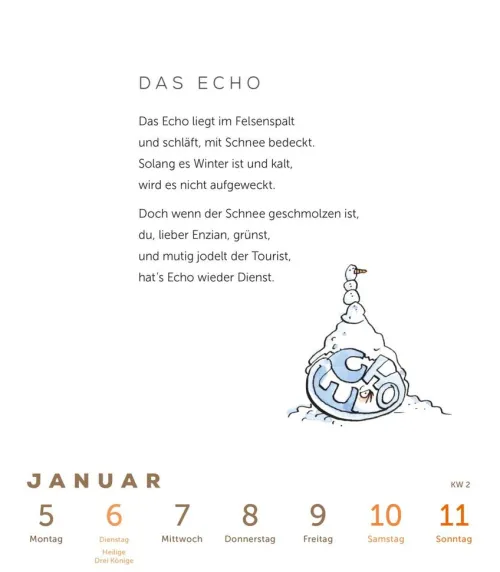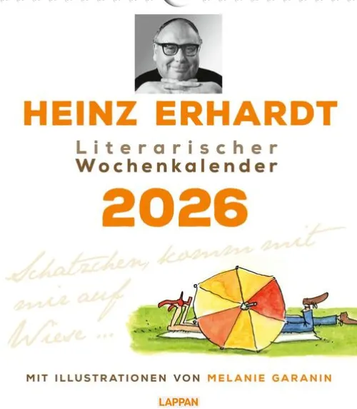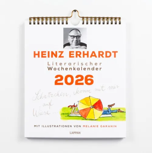Der schon mehrmals mit dem Gregor Calendar Award ausgezeichnete »Heinz Erhardt Literarischer Wochenkalender« vom Lappan Verlag ist ein wunderbares Geschenk für die Freunde des großen Sprachmeisters. Dieser Kalender vereint auf 53 Seiten, Woche für Woche, die schönsten Gedichte und Sprüche von Heinz Erhardt. So kommt man leicht und lustig durch das Jahr 2026 und erfreut sich immer wieder an dem einzigartigen Humor dieses besonderen Literaturkalenders.