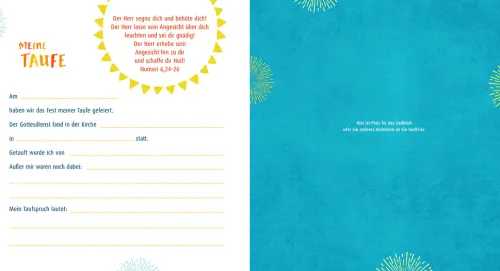 Dieses wunderschön gestaltete Album bietet Raum für alle Erinnerungen rund um das Fest der Taufe. Neben Texten bekannter Autoren gibt es jede Menge Platz zum Eintragen und Selbstgestalten, für Fotos und andere Andenken sowie für Gedanken und Wünsche der Eltern, Taufpaten und Gäste. Es ist geschlechtsneutral gestaltet und ökumenisch einsetzbar und eignet sich nicht nur für die Babytaufe, sondern auch für die Taufe im Erstkommunionalter.