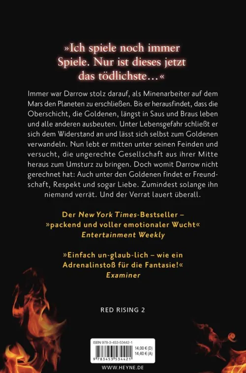 Immer war Darrow stolz darauf, als Minenarbeiter auf dem Mars den Planeten zu erschließen. Bis er herausfand, dass die Oberschicht, die Goldenen, längst in Saus und Braus leben und alle anderen ausbeuten. Unter Lebensgefahr schloss er sich dem Widerstand an und ließ sich selbst zum Goldenen verwandeln. Nun lebt er mitten unter seinen Feinden und versucht die ungerechte Gesellschaft aus ihrer Mitte heraus zum Umsturz zu bringen. Doch womit Darrow nicht gerechnet hat: auch unter den Goldenen findet er Freundschaft, Respekt und sogar Liebe. Zumindest so lange ihn niemand verrät. Und der Verrat lauert überall.