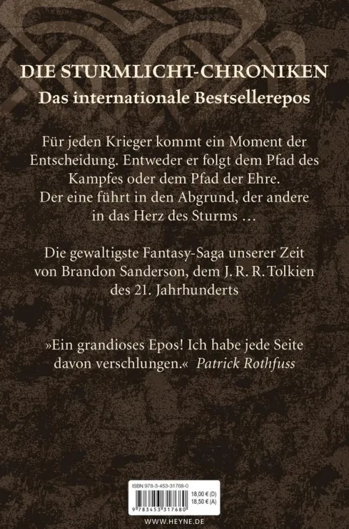 Einst wurde die Sturmwelt Roschar von mächtigen Kriegern beherrscht, deren magische Schwerter über Leben und Tod entschieden. Doch seit der König von Alethkar ermordet wurde, sind die einflussreichsten Fürsten des Landes zerstritten, und das Reich droht im Chaos zu versinken. Dalinar, der Bruder des ermordeten Königs, träumt davon, das Königreich wieder zu vereinen. Ein Traum, den er nur verwirklichen kann, wenn er dem Geheimnis der magischen Klingen auf die Spur kommt. Ein Traum, dessen Erfüllung die dunklen Mächte, die den Tod von Dalinars Bruder zu verantworten haben, unbedingt verhindern wollen.