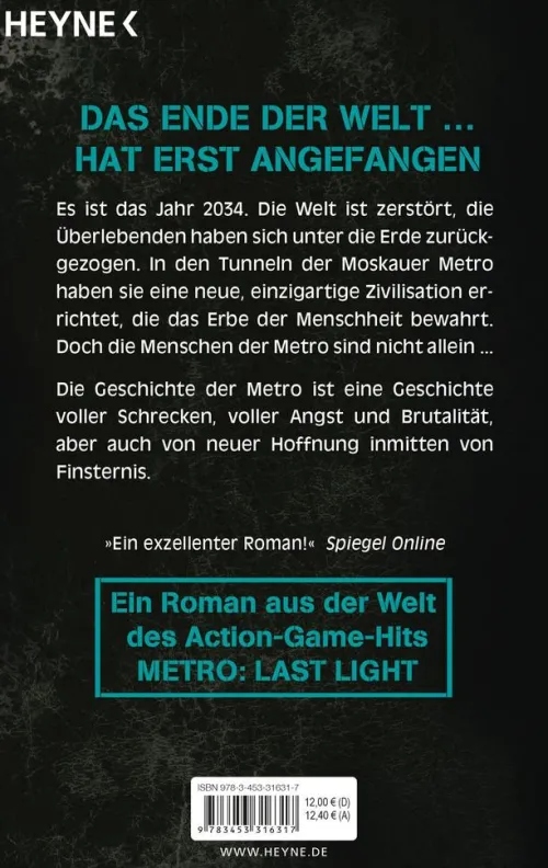 Wir schreiben das Jahr 2034. Nach einem verheerenden Krieg liegen weite Teile der Welt in Schutt und Asche. Auch Moskau ist eine Geisterstadt. Die Überlebenden haben sich in die Tiefen des U-Bahn-Netzes zurückgezogen und dort eine neue Zivilisation errichtet. Eine Zivilisation, wie es sie noch nie zuvor gegeben hat . . .