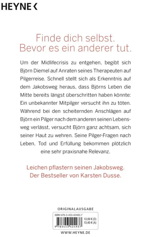 Um der Midlifecrisis zu entgehen, begibt sich Björn Diemel auf Anraten seines Therapeuten auf Pilgerreise. Schnell stellt sich als Erkenntnis auf dem Jakobsweg heraus, dass Björns Leben die Mitte bereits längst überschritten haben könnte: Ein unbekannter Mitpilger versucht, ihn zu töten. Während bei den scheiternden Anschlägen auf ihn ein Pilger nach dem anderen seinen Lebensweg verlässt, versucht Björn ganz achtsam, sich seiner Haut zu wehren. Seine Pilger-Fragen nach Leben, Tod und Erfüllung bekommen plötzlich eine sehr praxisnahe Relevanz.