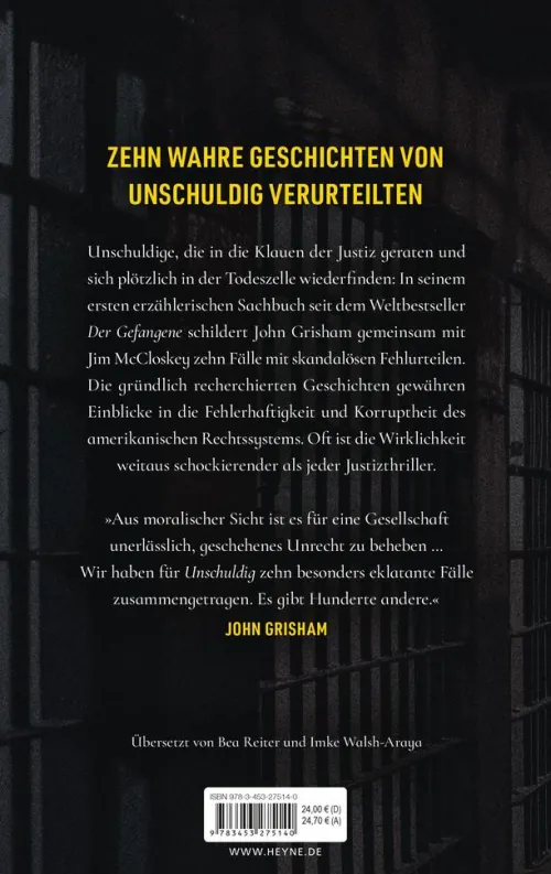 Unschuldige, die in die Klauen der Justiz geraten und sich plötzlich in der Todeszelle wiederfinden: In seinem ersten erzählerischen Sachbuch nach dem Weltbestseller »Der Gefangene« schildert John Grisham gemeinsam mit dem Gründer von Centurion Ministries, Jim McCloskey, zehn wahre Fälle skandalöser Verurteilungen. Perfekt recherchiert und packend geschrieben, gewähren die unglaublichen Geschichten einen erschütternden Einblick in die Fehlerhaftigkeit des amerikanischen Justizsystems. John Grisham at his best!