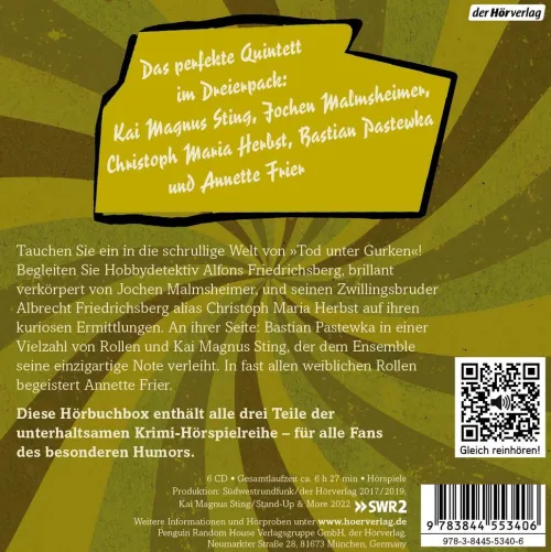 Tauchen Sie ein in die schrullige Welt von »Tod unter Gurken«! Begleiten Sie Hobbydetektiv Alfons Friedrichsberg, brillant verkörpert von Jochen Malmsheimer, und seinen Zwillingsbruder Albrecht Friedrichsberg alias Christoph Maria Herbst auf ihren kuriosen Ermittlungen. An ihrer Seite: Bastian Pastewka in einer Vielzahl von Rollen und Kai Magnus Sting, der dem Ensemble seine einzigartige Note verleiht. In fast allen weiblichen Rollen begeistert Annette Frier. Diese Hörbuchbox enthält alle drei Teile der unterhaltsamen Krimi-Hörspielreihe – für alle Fans des besonderen Humors.