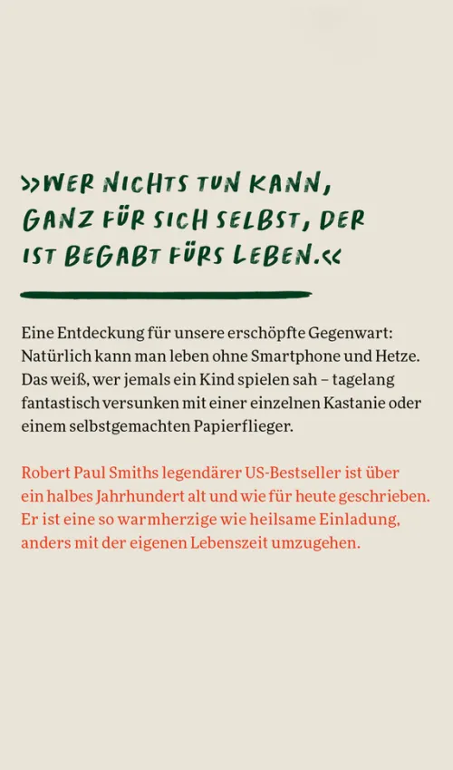 Eine warmherzige wie heilsame Einladung, anders mit der eigenen Lebenszeit umzugehen. »Alle sollten dieses Buch haben. Also wirklich alle! « Axel HackeEine Entdeckung für unsere erschöpfte Gegenwart: Natürlich kann man leben ohne Smartphone und Hetze. Das weiß, wer jemals ein Kind spielen sah – tagelang fantastisch versunken mit einer einzelnen Kastanie, einem Stock oder einem selbstgemachten Bumerang. Robert Paul Smiths legendärer US-Bestseller richtet sich an alle in jedem Alter, die einfach für sich selbst Zeit haben wollen. Wie baut man einen Papierflieger? Was kann man mit dem herrlich geformten Kern eines Pfirsichs anstellen? Dieses Geschenk von einem Buch ist keine schlichte Bastelanleitung. Sondern eine so warmherzige wie heilsame Einladung, anders mit der eigenen Lebenszeit umzugehen. Es ist über ein halbes Jahrhundert alt und wie für heute geschrieben.