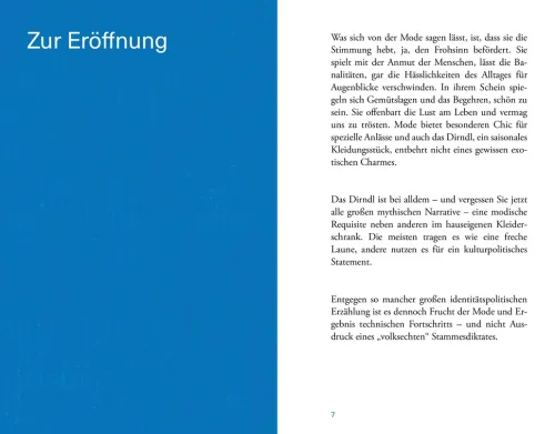 „Das Dirndl ist bei alldem – und vergessen Sie jetzt alle großen mythischen Narrative – eine modische Requisite neben anderen im hauseigenen Kleiderschrank. Die meisten tragen es wie eine freche Laune, andere nutzen es für ein kulturelles Statement. Entgegen so mancher großen identitätspolitischen Erzählung ist es dennoch Frucht der Mode und Ergebnis technischen Fortschritts – und nicht Ausdruck eines , volksechten‘ Stammesdiktates.“
