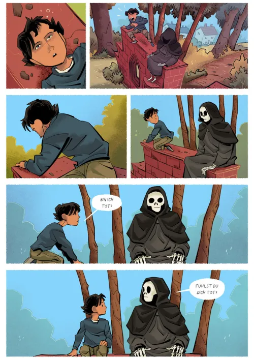 Das war knapp! Beim Herumklettern in der alten Klosterruine wäre Lukas beinahe abgestürzt. Er hätte sich den Hals brechen können! Das sieht der Tod offenbar ähnlich, denn er sitzt bereits neben Lukas: Kutte, Kapuze, Totenschädel, das volle Programm. Obwohl es für ihn hier nichts zu holen gibt, schaut Tod von nun an ab und zu bei Lukas vorbei – wenn schließlich schon mal ein junger Mensch an den Sensenmann glaubt! Als einige Zeit später Lukas‘ väterlicher Freund Johann im Dorfteich ertrinkt, ist es Tod, der dem Jungen fachkundig versichert, dass dies kein Unfall war! Mit viel Scharfsinn und ein klein wenig Magie machen die beiden sich auf Spurensuche. Was macht Gevatter Tod dieser Tage, da kaum noch jemand an ihn glaubt? In seiner glorreichen Vergangenheit schwelgen und still in Vergessenheit geraten? Nein. Er schließt sich mit einem cleveren Jungen zusammen und gründet die ungewöhnlichste Detektei des Diesseits!