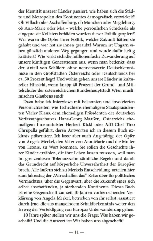 Die desaströsen Auswirkungen auf Gesellschaft, Wirtschaft, Bildung, Sicherheit und die Sozialsysteme Europas sind mittlerweile deutlich zu spüren. Gewalt an den Schulen, Bildung von Parallelgesellschaften, Terroranschläge und der „Einzelfall“ stehen mittlerweile an der traurigen Tagesordnung. Der Wiener Schuldirektor Christian Klar zeichnet ein düsteres Bild vom heutigen Schulalltag. Und die Eltern von Ann-Marie und die Mutter von Leonie schildern, welch Leid der bestialische Mord an ihren Kindern über ihre Familien und Freunde gebracht hat.