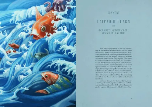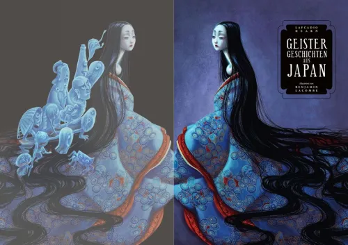 Ein echter Lacombe der unheimlichen Art Benjamin Lacombe ist schon seit langer Zeit ein großer Fan der Kultur Japans, in der modernste Technik mit der Vorstellung einer von Geistern belebten Natur einhergeht. So war es unausweichlich, dass er irgendwann auf die berühmte Sammlung japanischer Gespenstergeschichten von Lafcadio Hearn stieß. Besonders dürfte ihn die Geschichte fasziniert haben, in der ein Junge aus dem Tempel gewiesen wird, in dem er zum Priester ausgebildet werden soll, weil er fortwährend zeichnet. In seiner letzten Nacht im Tempel, bevor ihn der Priester mit dem Rat nach Hause schickt, doch besser Künstler zu werden, hört der Junge den Lärm eines schrecklichen Gemetzels. Als er sich schließlich aus seinem Versteck wagt, sieht er einen riesigen Rattendämon in seinem Blut liegen. Die vielen Katzen, die er während der Lehrstunden gezeichnet hatte, haben dem Dämon den Garaus gemacht. Seine Zeichenkunst hat dem Jungen Macht über Dämonen gegeben!