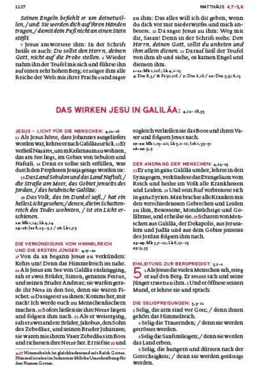 Diese Bibelausgabe ist im zweispaltigen Satz auf hochwertigem Bibeldünndruckpapier im zweifarbigen Layout unter Verwendung der Schmuckfarbe Rot für eine bessere Übersichtlichkeit gedruckt. Diese Gesamtausgabe der Einheitsübersetzung ist mit einer besonders großen Schriftgröße in großem Format gestaltet. Ergänzt wird die Großdruckbibel durch Einführungen in jedes biblische Buch, Zwischenüberschriften, Anmerkungen, Verweisstellen und einem Anhang mit Stichwort- und Personenregister, Zeittafel mit Sacherläuterungen und neun Karten. Zusätzliche Sonderseiten erleichtern den Einstieg ins Bibellesen:- Wie finde ich eine Bibelstelle? – Bibeltexte zum Entdecken- GPS-Daten für biblische OrteDiese Bibelausgabe ist im zweispaltigen Satz auf hochwertigem Bibeldünndruckpapier im zweifarbigen Layout unter Verwendung der Schmuckfarbe Rot für eine bessere Übersichtlichkeit gedruckt.