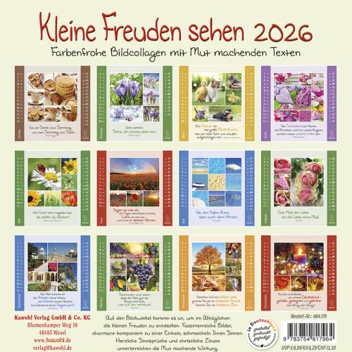 Stimmungsvolle BildcollagenAuf den Blickwinkel kommt es an, um im Alltäglichen die kleinen Freuden zu entdecken. Facettenreiche Bilder, charmant komponiert zu einer Einheit, schmeicheln Ihren Sinnen. Herzliche Sinnsprüche und christliche Zitate unterstreichen die Mut machende Wirkung. Postkarten-Kalender 16 x 16 cm14 Blätter, Postkartenkarton, Spiralbindung, Aufsteller.