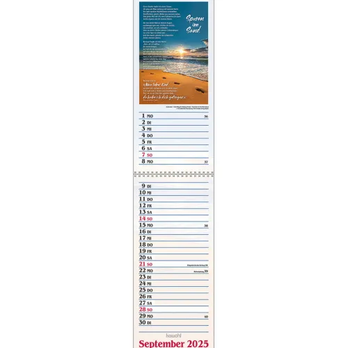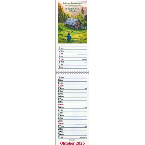 Terminer – gute Gedankenstützen für Ihr ZuhauseDieser Terminer ist aufwändig gestaltet, mit leicht gesoftetem, gut beschreibbarem Untergrund, den beliebten Kawohl-Postermotiven und christlichen Texten. DOUBLE-SIZE-Terminer:- Streifenkalender, 14 x 31 cm (aufgeklappt 62 cm)- mit christlichen Texten und Bibelversen- mit aussagestarken Fotos- beschreibbarer Karton