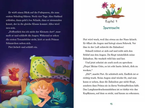 Der erste Wackelzahn wackelt und der neue Schulranzen ist schon umgeschnallt – nun ist Piet wirklich bereit für die Schule. Wie gut, dass er seinen Mutzahn hat! Wenn er den mit der Zunge berührt, fühlt Piet sich groß und stark. Doch dann ist die erste Zahnlücke da und ausgerechnet der Mutzahn fehlt! Auf keinen Fall kann Piet so zur Schule gehen. Wo soll er nun eine ordentliche Portion Mut herbekommen? Ein Glück, dass Piet gute Freunde an seiner Seite hat: Das freche Drachenmädchen Prima, das eines Tages aus seinem Schulranzen klettert, und die neugierige Polly, mit der Piet ein echtes Zeltabenteuer erlebt. Gemeinsam kann die Wackelzahn-Bande alles schaffen – auch den aufregenden ersten Schultag . . .
