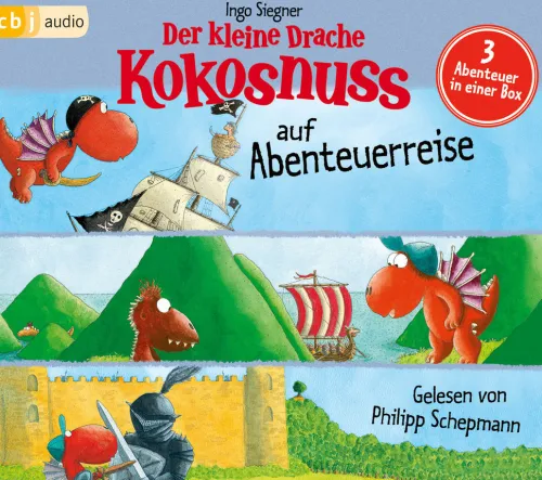 Diese Hörbuch-Box enthält die Abenteuer-Hörbücher „Der kleine Drache Kokosnuss und der schwarze Ritter“, „Der kleine Drache Kokosnuss und die wilden Piraten“ und „Der kleine Drache Kokosnuss und die starken Wikinger.