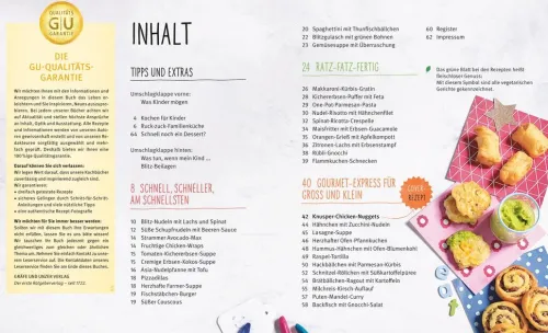 - Tipps und Extras: Ausgewogen Kochen für Kinder, die besten Zeit-Spar-Tricks, geschickt anrichten für Kinderaugen, fünf schnelle Beilagen und Hilfen für kleine Essensverweigerer