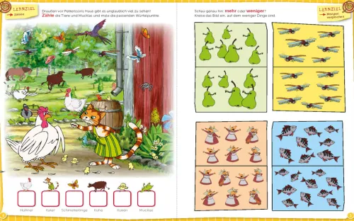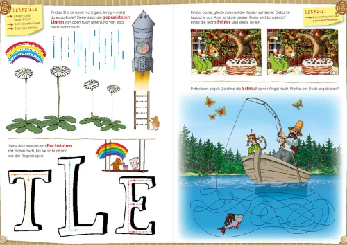 Die große Vorschulbuchreihe von Pettersson und Findus bereitet Kinder perfekt auf den Schulstart vor. Zukünftige ABC-Schützen lernen hier Laute, Buchstaben und Zahlen zu erkennen, Schwungübungen zu machen, zu Reimen, ein Zahlen-, Mengen- und Größenverständnis zu entwickeln sowie Gemeinsamkeiten und Unterschiede zu erkennen. Dabei stehen Spaß, spielerisches Lernen und ein altersgerechter Schwierigkeitsgrad im Vordergrund: „Mein Übungsheft für die Vorschule“ bietet spielerische Aufgaben zu Zahlen und Buchstaben, Wochentagen, Uhrzeit und vielem mehr.