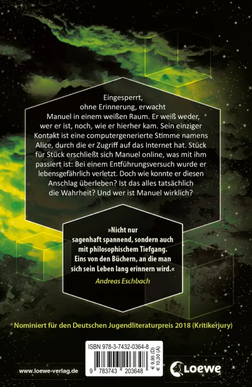 Ein packender Thriller, in dem nichts ist, wie es zunächst scheint. Auf spannendste Weise spielt Spiegel-Bestsellerautor Karl Olsberg in diesem Jugendbuch mit den Gefahren virtueller Welten und künstlicher Intelligenz und wirft fundamentale philosophische Fragen nach Realität und Identität auf. Spannung bis zum Schluss, mit einem Twist, der den Atem raubt!