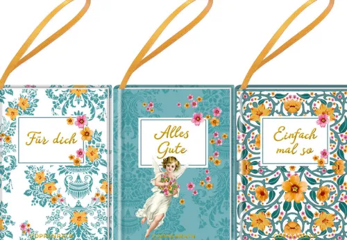 Diese niedlichen Mini-Bücher mit Satinschlaufe lassen sich wunderbar an einem Blumenstrauß, einer Flasche oder einem hübsch verpackten Geschenk befestigen und überbringen zu allen fröhlichen Anlässen liebevolle Wünsche und Grüße. Auf der ersten Seite ist außerdem Platz zum Eintragen einer persönlichen Widmung.