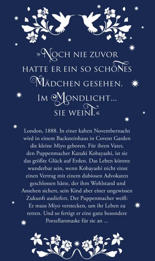 London, 1888. In einer kalten Novembernacht wird in einem Backsteinhaus in Covent Garden die kleine Miyo geboren. Für ihren Vater, den Puppenmacher Kazuki Kobayashi, ist sie das größte Glück auf Erden. Das Leben könnte wunderbar sein, wenn Kobayashi nicht einst einen Vertrag mit einem dubiosen Advokaten geschlossen hätte, der ihm Wohlstand und Ansehen sichert, sein Kind aber einer ungewissen Zukunft ausliefert. . .