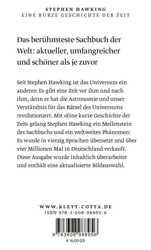 Seit Stephen Hawking ist das Universum ein anderes: Es gibt eine Zeit vor ihm und nach ihm, denn er hat die Astronomie und unser Verständnis für das Rätsel des Universums revolutioniert. Mit »Eine kurze Geschichte der Zeit« gelang Stephen Hawking ein Meilenstein des Sachbuchs und ein weltweites Phänomen: Es wurde in vierzig Sprachen übersetzt und über elf Millionen Mal verkauft.