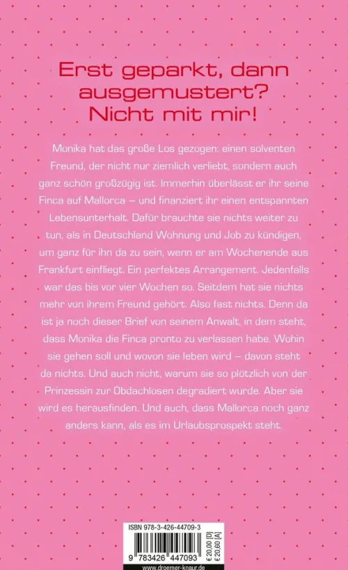 Monika hat das große Los gezogen: Einen solventen Freund, der nicht nur ziemlich verliebt, sondern auch ganz schön großzügig ist. Immerhin überlässt er ihr seine Finca auf Mallorca und finanziert ihr einen entspannten Lebensunterhalt. Dafür brauchte sie nichts weiter zu tun, als in Deutschland Wohnung und Job zu kündigen, um ganz für ihn da zu sein, wenn er am Wochenende aus Frankfurt einfliegt. Ein perfektes Arrangement. Jedenfalls war das bis vor vier Wochen so. Seitdem hat sie nichts mehr von ihrem Freund gehört. Also fast nichts. Denn da ist ja noch dieser Brief von seinem Anwalt, in dem steht, dass Monika die Finca pronto zu verlassen habe. Wohin sie gehen soll und wovon sie leben wird davon steht da nichts. Und auch nicht, warum sie so plötzlich von der Prinzessin zur Obdachlosen degradiert wurde. Aber sie wird es herausfinden. Und auch, dass Mallorca noch ganz anders kann, als es im Urlaubsprospekt steht.