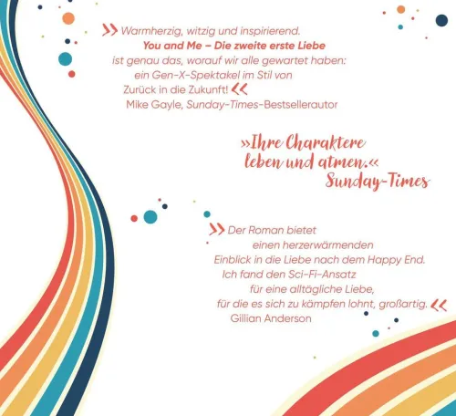 »You and Me – Die zweite erste Liebe bietet einen herzerwärmenden Einblick in die Liebe nach dem Happy End. Ich fand den Sci-Fi-Ansatz für eine alltägliche Liebe, für die es sich zu kämpfen lohnt, großartig. « Gillian Anderson