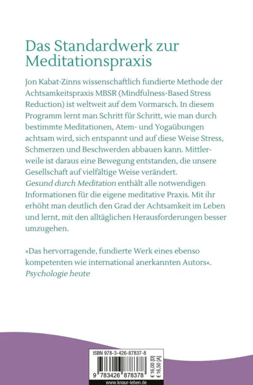 »Gesund durch Meditation« hat sich als eines der erfolgreichsten Bücher etabliert, um schrittweise Gelassenheit, Präsenz und dauerhafte Gesundheit zu erlangen. Das wissenschaftlich geprüfte Achtsamkeitstraining MBSR (mindfulness-based stress reduction) kombiniert Meditationen, Atem- und Yoga-Übungen zu einem ganzheitlichen Ansatz. Der weltweit renommierte Achtsamkeits-Lehrer und Meditations-Forscher Jon Kabat-Zinn hat mit der MBSR-Methode Meditation für das alltägliche Leben der Menschen zugänglich gemacht. Wie hilfreich eine solche Praxis gerade in herausfordernden Zeiten sein kann, wird nirgendwo so deutlich, wie in diesem Grundlagenbuch.